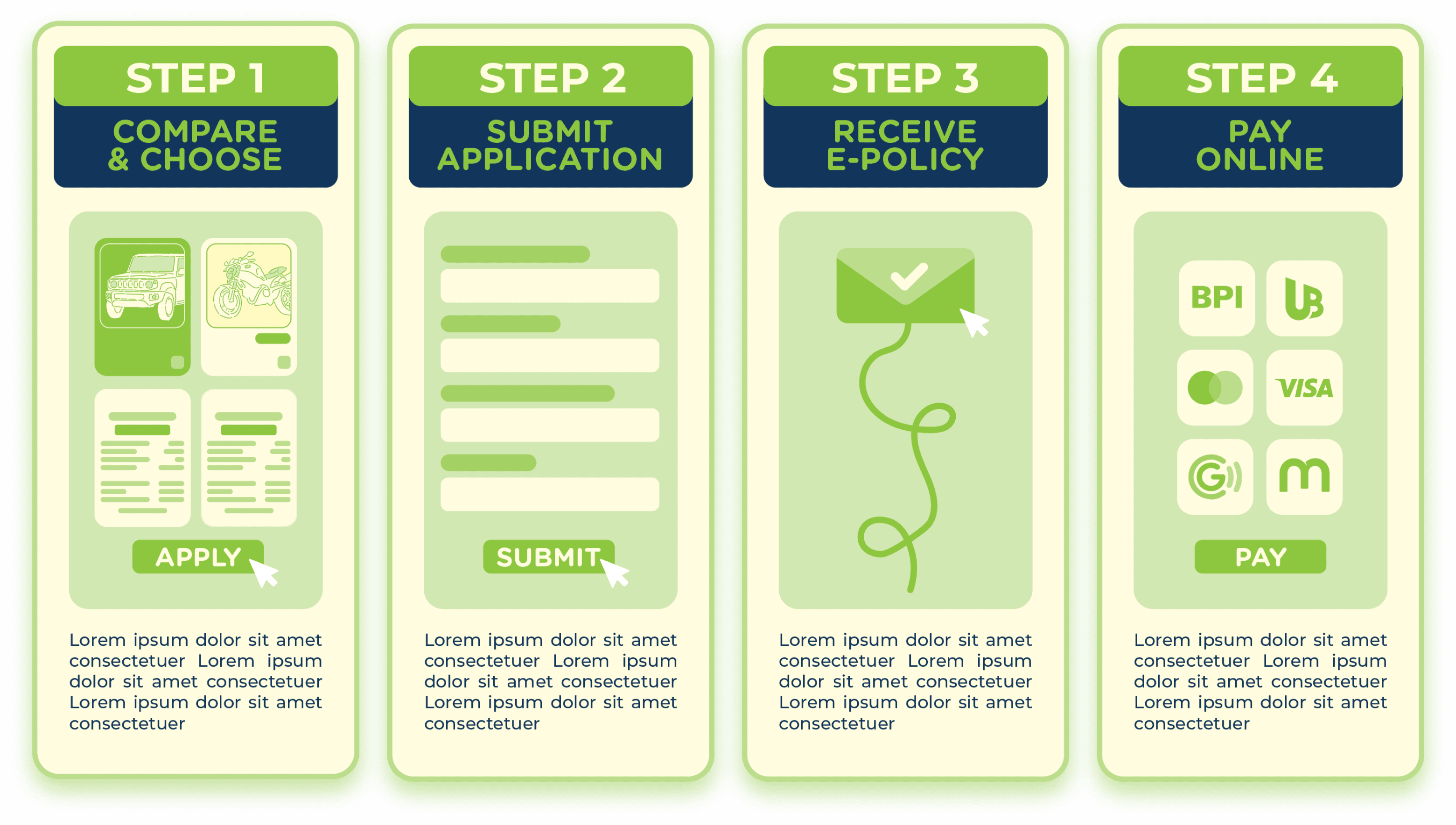 The key visuals employ a fresh, energetic aesthetic dominated by a signature palette of vibrant lime green, deep navy, and clean white. The design strategy prioritizes high readability and user guidance, utilizing bold typography, distinct color blocking, and a mix of flat vector illustrations and lifestyle photography.